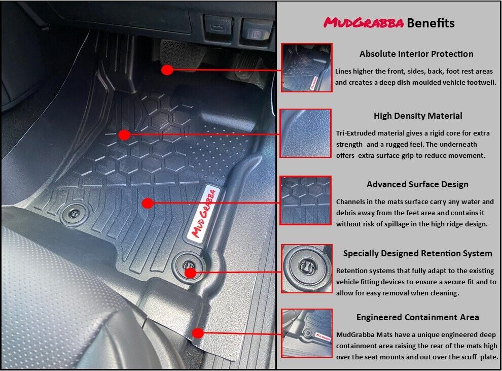 The MUDGRABBA Mat has been developed on the back of some twenty years experience in manufacturing 4WD floor mats in Australia including the now famous Sandgrabba Mats and unlike the competitors each mat fully covers the foot wells of the 4wd, going up the firewall and back to the seat brackets also covering the sill over the scuff plates ensuring what most mats can't do, MUDGRAABA keeps everything outside where it belongs.
